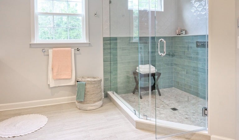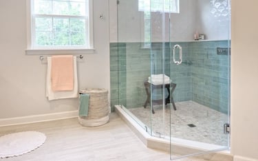 Bathroom with glass shower and stone floor, natural light, minimalist decor with colorful bath towels and glass panel on the wall.