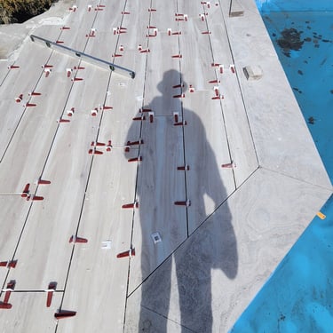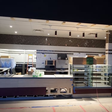 Construction of a commercial building in progress, with the wall and roof structure almost finished, team of workers on site.